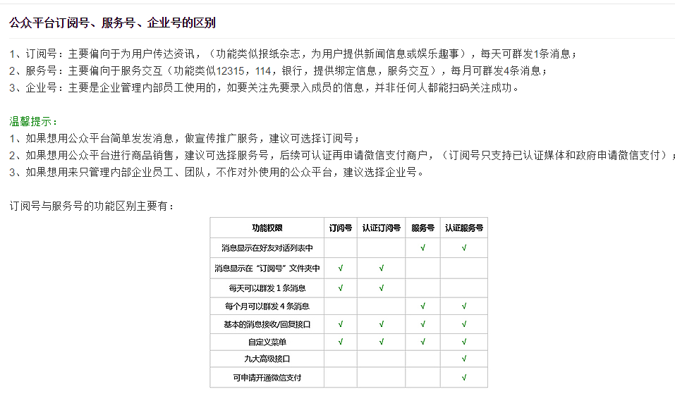 服務(wù)號(hào):主要偏向于服務(wù)交互,每月可群發(fā)4條消息;(一次可群發(fā)8條圖文消息)對(duì)外推廣!