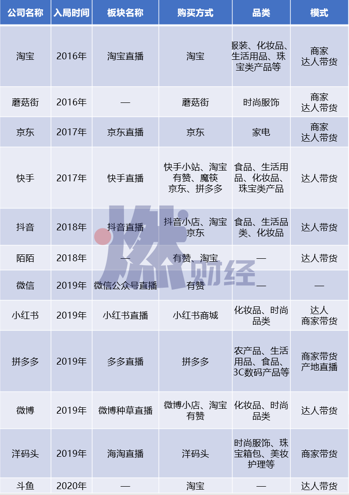 老牌玩家競(jìng)爭(zhēng)激烈,新的玩家還在陸續(xù)涌入。燃財(cái)經(jīng)根據(jù)公開信息,整理出一份入局直播電商的不完全名單。