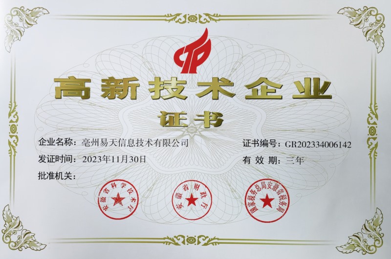 高新技術(shù)企業(yè)證書是對企業(yè)在技術(shù)研發(fā)、產(chǎn)品創(chuàng)新、市場競爭力等方面綜合實力的權(quán)威評價。獲得這一證書,不僅意味著亳州易天科技在技術(shù)研發(fā)和創(chuàng)新方面取得了顯著成就,還代表著公司在推動行業(yè)技術(shù)進(jìn)步、促進(jìn)地方經(jīng)濟發(fā)展等方面做出了積極貢獻(xiàn)。